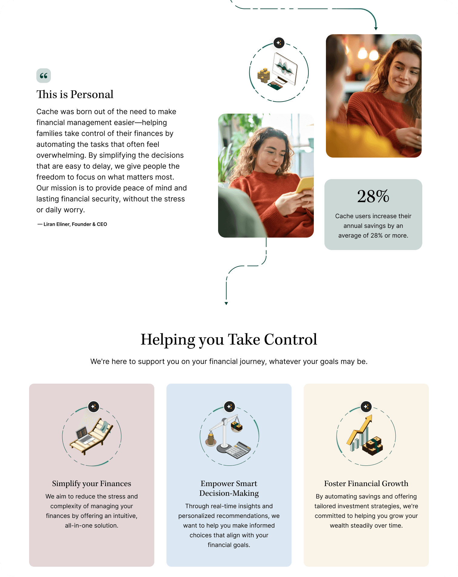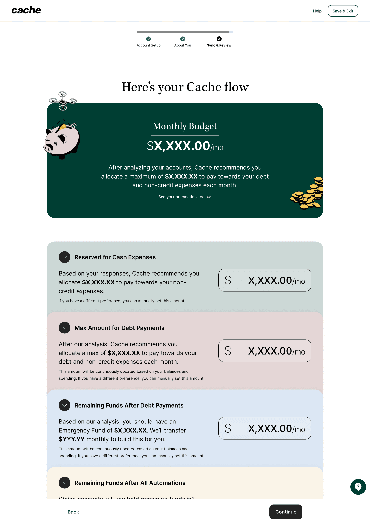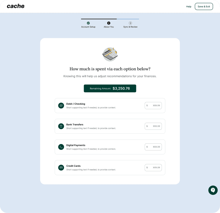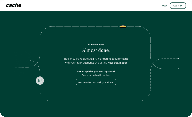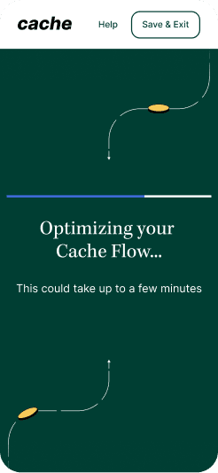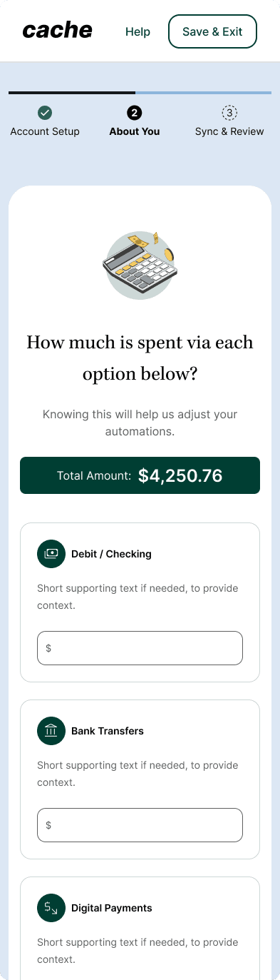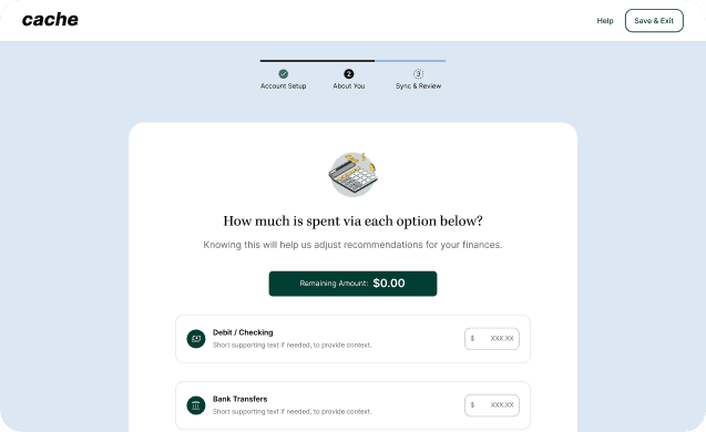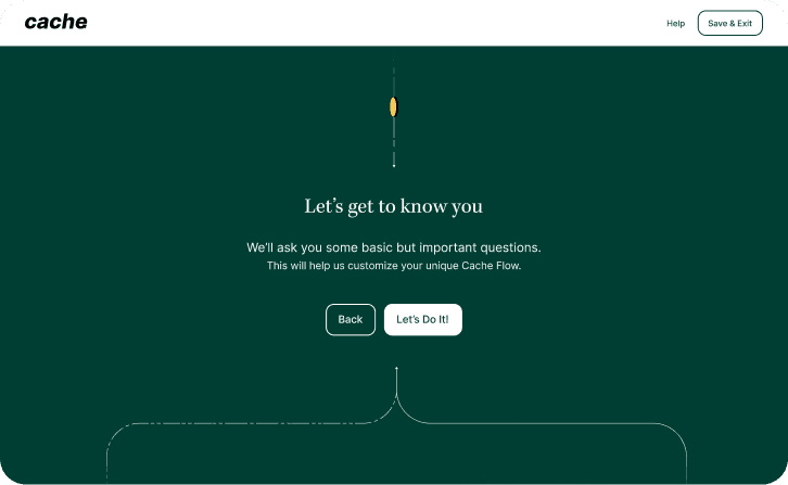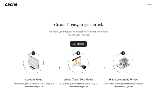 Focused on early trust, transparency, and value realization. It’s not “connect your bank.” It’s “Tell Cache how to help.”